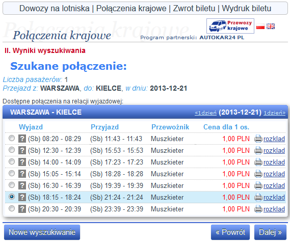 Przewozy na tej trasie Kielce - Warszawa oraz Warszawa - Kielce objęte zostały specjalną promocją. Pula Biletów jest ograniczona. Wszystkich podróżujących tymi liniami zachęcamy do skorzystania z zakupów online. Bilety objęte promocjąmożna kupować wyłącznie w jedną stronę. W przypadku wyboru trasy w obu kierunkach system rezerwacji będzie stosował normalną stawkębez uwzględniania promocyjnych cen.